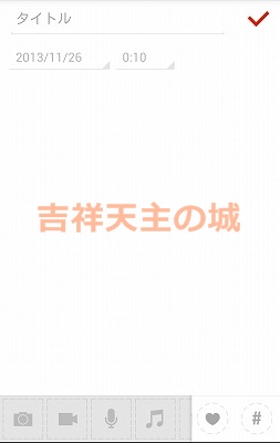先ず、ライフログを記入する画面はこんなにシンプルです。タイトル、日付、本文だけ。もちろん写真や動画なども下のアイコンを押せば、簡単に貼り付けることができます。